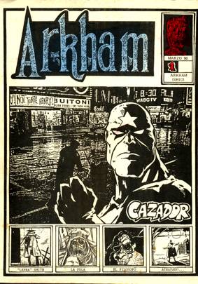 En marzo de 1990 unos jóvenes Jorge “Lucas” Pereira y Claudio Ramírez publican el primer (y único) número de la revista Arkham, una antología que no desentonaba en absoluto con el espíritu de aquella explosión fanzinera de finales de los ’80. En esas páginas, que incluían trabajos de Walther Taborda, Cuk y Ralveroni, y hasta una historieta corta de Gene Colan, Lucas escribe y dibuja la primera historieta con el título “Cazador”. Quien porta el nombre en este debut (con armamento, capucha y estrella en la frente) es un científico norteamericano llamado Robert Howard. Luego de trabajar para el gobierno de su país en una investigación sobre la caída de un OVNI, descubre que se está utilizando un tubo cilíndrico encontrado allí para fabricar un arma de destrucción masiva. Decide abandonar el proyecto solo para, poco después, encontrar a su esposa y su hija muertas en un misterioso accidente. Finalmente, protegido por su nueva identidad, busca desmantelar la operación gubernamental y cobrarse venganza por el asesinato de su familia. En este primerizo trabajo de Lucas se nota una fuerte influencia de Frank Miller y su Dark Knight, además de muchos guiños a clásicos del terror, casi una constante dentro de su obra (junto a Howard aparecen personajes con nombres como Arthur Machen, Blackwood, Tolkien, entre otros).