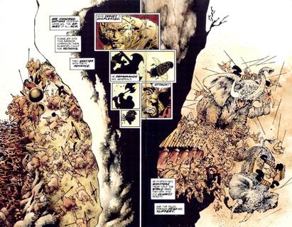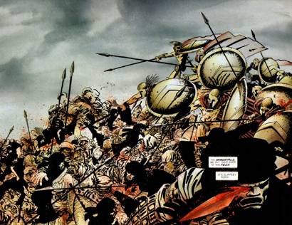Que una obra ovacionada por la crítica levante discusiones entre los lectores no es para nada un hecho infrecuente. Para entender mejor este caso quizás haya que dejar de lado los aspectos ideológicos -se la ha acusado de demasiado maniquea y hasta de fascista-, y de rigor histórico para concentrarnos en la construcción de la obra, tanto en el aspecto estético como narrativo. Y aquí 300 gana en todos los frentes. La composición rupturista de la página ya desde la elección misma de su formato, con una viñeta central que la abarca por completo acompañada de otras más pequeñas, casi minúsculas, le otorgan a la obra -contra todos los pronósticos- una fluidez narrativa excepcional. Esto se logra, es obvio, por el oficio de Miller, sus años de trabajo y su amplio conocimiento del campo. “Me gusta sintetizar las cosas –cuenta-, y hay momentos de mis guiones que no me agradan demasiado porque me dejo llevar con el discurso. 300 fue un maravilloso ejercicio de síntesis. Hay que tener en cuenta las exigencias de la historia, y además tampoco se puede hacer una historia de espartanos locuaces. Eran gente de pocas palabras”. En la faz gráfica, el comic es todo lo que puede esperarse del autor de The return of the Dark Knight, con un bienvenido regreso al color luego del furioso blanco y negro de Sin City. Y esto trae también el regreso de Lynn Varley, que –vale la pena repetirlo- se despacha a gusto con un bellísimo trabajo en los fondos y las vestimentas de los personajes.