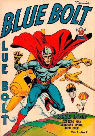 En 1940, Kirby conoció a otro muchacho un par de años mayor que él, que escribía y dibujaba historietas para varias editoriales: Joe Simon. Juntos darían vida a Blue Bolt, un superhéroe que pasó por varias editoriales y se publicó durante toda la década del ´40. El nº2 de Blue Bolt marcaría la primera colaboración entre estos dos amigos de cuya complicidad saldrían una imparable catarata de creaciones. Ese mismo año, Kirby y Simon aportan material a varias revistas de Timely (acá crean a personajes hoy olvidados como Mercury, Hurricane, The Vision, Red Raven, Comet Pierce y el bizarro Tuk the Cave Boy) y colaboran también en la editorial Fawcett, hogar del Captain Marvel original. La dupla le había agarrado el gustito a esto de los superhéroes y por ahí iba a aparecer su primer gran éxito.