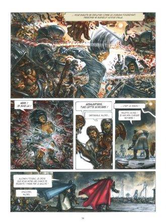 Yo, Dragón tuvo un primer tomo en 2011, un segundo tomo en 2013 y el tercero vio su salida demorada hasta 2016, porque Giménez debió cambiar de editorial a mitad de camino por un conflicto con el sello Le Lombard y completar la trilogía en Glénat. En Yo, Dragón, el capo de la ciencia-ficción se anima a cambiar totalmente de registro y se tira sin paracaídas a la epopeya medieval, con castillos, caballeros, señores feudales poderosos, caballeros valientes, cortesanos intrigantes, curas medio pasados de rosca, conspiraciones, destierros, enfermedades espantosas, duelos, banquetes, sitios y por supuesto, dragones. La ambientación es otra, pero siguen ahí el trabajo inhumano en espadas, armaduras, ejércitos, fondos, cuerpos y hasta vemos unas figuras humanas en acción con un dinamismo poco frecuente en las páginas de Giménez. Como siempre, el golpe letal, la fatality, nos la hace con su alucinante manejo del color, con esos engamados en los que predominan los colores fríos u opacos (marrón, gris, celeste, blanco) y cada tanto irrumpe un rojo furibundo o un amarillo descontrolado y la viñeta explota más allá de cualquier análisis.