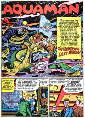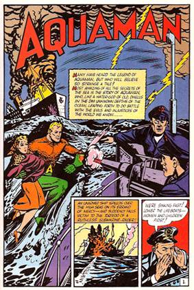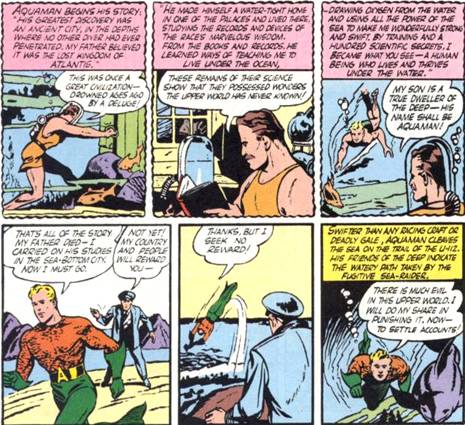 En estas escasas ocho páginas, Aquaman no sólo frustra los malignos planes de los nazis, sino que hasta tiene tiempo de batir algunas postas sobre su origen: Su padre, muerto poco antes, era un famoso explorador de los océanos, y su madre había muerto cuando él era muy chico. El padre de Aquaman le enseñó secretos científicos que lo capacitaron para vivir y respirar bajo el agua y “usar el poder del mar para hacerme maravillosamente fuerte y veloz”. O sea que, en un principio, estamos hablando de un humano científicamente alterado para convertirse en un poderoso anfibio, capaz de hablar con los peces y agujerear un submarino de una trompada. No está mal…