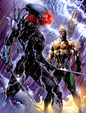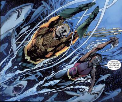 De hecho, si exceptuamos a Deadman, probablemente sea Aquaman el personaje con más protagonismo y más desarrollo a lo largo de la maxiserie. El guión le reserva un rol importante a Mera (como ya lo había hecho en Blackest Night) y además se esfuerza por introducir a un nuevo Aqualad, esta vez un chico afroamericano oriundo de New Mexico, llamado Jackson Hyde. Seguramente para coincidir con el lanzamiento en la tele de los dibujos animados de Young Justice, en los que un Aqualad de tez oscura lidera al equipo y tiene una chapa infinita, Johns y Tomasi desempolvan el concepto de Aqualad, esta vez con poderes similares a los de Mera y emparentado con Black Manta, el archienemigo de Aquaman.