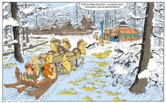 Los autores se toman MUY a pecho el tema de «nos toca desarrollar una aventura fuera de la aldea»: en todo el álbum hay UNA SOLA viñeta ambientada en la aldea, que es justamente la última. O sea que los únicos galos que llegan a meter un bocadillo de diálogo son los tres que participan del viaje: Astérix, Obélix y Panoramix que, pobre, tiene un rol bastante menor. Pero este no es el único salto al vacío: acá por primera vez el barco de los piratas NO es atacado, también por primera vez Idefix tiene un rol destacadísimo en la resolución del conflicto, por primera vez NO vemos el viaje (Ferri y Conrad lo narran en unas que se publicaron previamente por fuera del álbum), sino que la acción empieza cuando los galos entran en contacto con quienes serán sus anfitriones, y también por primera vez, NADIE toma ni un sorbo de poción mágica. No sé si Ferry y Conrad estaban esperando que se muriera Uderzo para cometer todas estas «herejías», pero lo cierto es que las aplaudo de pie.