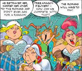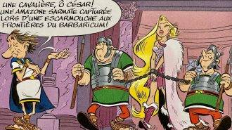 Los chistes que complementan a la aventura son muy buenos, y (como en los buenos álbumes de Astérix) se nutren bastante de la realidad de nuestro presente. Ferri se ríe de los terraplanistas, mete gags relacionados con las fake news y el poder de la desinformación, con la distancia social y el confinamiento (este álbum está íntegramente realizado durante la pandemia), con los abusos monopólicos de Amazon que perjudican a las librerías, con el empoderamiento de las mujeres… y por supuesto hay buenos chistes atemporales, como el del traductor que le hace decir lo que le conviene a la prisionera sármata cuya lengua no entienden los romanos. También es interesante el juego de espejos que proponen los autores cuando nos llevan a recorrer la aldea de los sármatas y nos invitan a reconocer en estos nuevos personajes a otros aldeanos que conocemos desde siempre. La diferencia (muy enfatizada y muy bien aprovechada tanto a la hora del humor como de la aventura) está en el rol que ocupan las mujeres en este remoto país al que viajan nuestros héroes. Y en el rubro «embocándola de pedo», quiso un capricho del destino que el remoto país donde está ambientado el álbum publicado apenas cuatro meses antes del estallido de la guerra en Ucrania, quede precisamente en las estepas del noreste europeo que hoy conocemos como Ucrania.