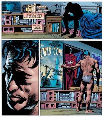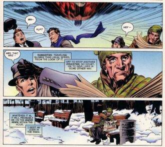 De esta primera tanda mi favorita, y en la que me pienso detener es la del nº 5. Llevada adelante casi como un relato navideño, esta historia invernal se centra en un anciano, que en realidad es un alíen infiltrado en la Tierra para reunir información para una potencial invasión (que llegara eventualmente en un futuro numero). La forma en la que está contada, lo miserable de la vida del “tipo” e incluso la manera en que se desata el desenlace con la señal enviada al espacio, es maravilloso y sobre todo original. Porque la idea del hombre común y cómo ve a los superhéroes Busiek ya la había planteado en Marvels, y si bien acá es llevada al extremo, no es hasta este punto -según yo lo veo- que notamos el verdadero potencial de la serie. Historias con alienígenas infiltrados en la Tierra para aportar información para una futura invasión hay montones, pero nunca nadie nos había dicho cómo es el día a día de esta persona, cómo se oculta a simple vista, cómo padece estar entre personas a las cuales detesta y sobre todo, qué esfuerzo hace por mantener una apariencia inofensiva frente a los demás. Todo esto lo vemos en este número, además de alguna otra sorpresa.