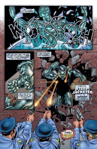 Así llegamos a la saga de Steel Jack, y al que probablemente sea el punto más bajo de la serie, donde nuevamente un arco largo (el más largo hasta el momento, con siete capítulos) palidece ante la contundencia de los unitarios. Acá la acción se centra en el antes mencionado Steel-Jacketed Man, un supervillano que consigue la libertad condicional después de 20 años en cana, lo difícil que le resulta reincorporarse a la vida social y mantenerse lejos del delito a pesar de haberse reformado y no tener interés en reincidir. La idea está buena, se mete con el tema de la rehabilitación carcelaria y critica -de forma velada- a un sistema penitenciario defectuoso. Pero la saga está muy estirada y cuando se aparta de estos temas, para meterse más en una serie de homicidios que Steel Jack tiene que investigar porque nadie se ocupa por tratarse de barrios marginales, y demás, empieza a hacer un poquito de agua. El otro punto fuerte de la saga es mostrar el lado B de los supervillanos: sus familias, sus vidas y qué pasa con ellas cuando los villanos están presos o muertos y n pueden mantenerlas. Insisto: las ideas son buenas, y la crítica social que trata de hacer sobre el mundo que le da la espalda a las familias de los criminales esta piola, pero no tiene la contundencia de otras historias. El propio Busiek se hace cargo de esto, y dice que en muy buena medida se debe a su enfermedad y a pasar, literalmente, meses volteado por los medicamentos al punto de casi no poder levantarse de la cama, ya no digamos sentarse a escribir. Se nota que todo esto influyó bastante en la calidad de esta saga, que empezó a salir en Abril del ´98 y finalizó recién a principios del 2000, casi dos años atado al mismo relato que es bastante irregular. Pero podemos perdonarlo, porque a la serie le quedan dos numeritos más y no están nada mal.