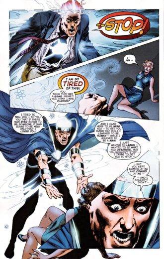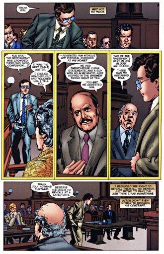 El broche de oro son los últimos dos capítulos, que forman un arquito en el que viajamos a 1974 para ver que un abogado debe probar la inocencia del hijo de un capo mafia cuando muchos testigos lo vieron partirle la cara a botellazos a una chica hasta matarla. Y en lo que parece un caso perdido, el tipo se las ingenia para aprovecharse del universo fantástico que lo rodea y despertar la duda en el jurado ¿Y si se trata de un gemelo malvado? ¿O fue controlado mentalmente? ¿Podría ser algún cambiaformas tomando su apariencia? La idea es fantástica: cómo un abogado desesperado cambia para siempre la jurisprudencia dentro del universo de la serie, en su afán por no quedar en malos términos con la mafia y poner su vida y la de su familia en riesgo, cosa que de todas formas termina sucediendo. Lo interesante es que es claro que el tipo es culpable, no hay medias tintas, salvo un tecnicismo que es que -en lugar de llevárselo del lugar donde ocurrió el homicidio- lo levanto la policía horas después en su casa. Eso solo alcanza para suponer un montón de cuestiones que ponen en duda la identidad del sujeto, aunque toda evidencia física diga lo contrario. Las maravillas de vivir en un mundo repleto de superseres. En lo personal, considero que es una de las mejores ideas de las muchas que desarrolla Busiek a lo largo de la serie, porque más allá de que si están mejor o peor tratadas, me gustan más o menos, son más o menos emotivas (esta en particular lo es bastante poco y nos cuesta empatizar con el abogado), hay conceptos que son geniales y levantan la historia por su propia existencia, como en este relato.