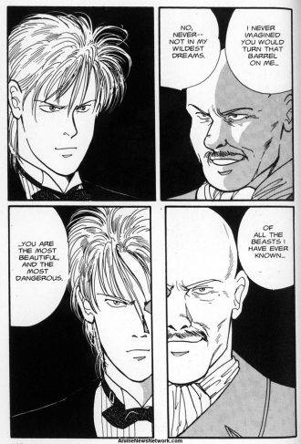 En Banana Fish hay un trabajo narrativo enorme. Más allá del talento de la autora, son evidentes la investigación de locaciones y, sobre todo, la puesta en escena. Hay muchas páginas donde el diálogo peca de ser excesivo, hay demasiadas explicaciones y una sensación de estática que es grave en los mangas. Sin embargo, es un recurso con el que Akimi Yoshida crea un tablero complejo en el que muchos personajes van a interactuar desde distintas posiciones. Es algo difícil de lograr y hacer que funcione. Aún más difícil explotarlo en varias sagas. Es aquí donde el manga brilla y se vuelve adictivo.
