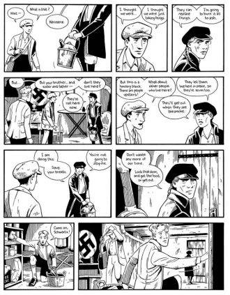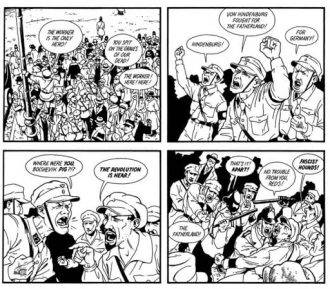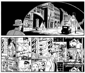 El segundo libro, Ciudad de humo, comienza unos meses después del fin del primero y nos presenta a una banda de jazz estadounidense compuesta por afroamericanos. La narrativa gráfica de Jason Lutes explotará a partir de este libro, y veremos secuencias totalmente mudas con un trabajo impecable. La influencia de Hergé y la línea clara está más presente que nunca (a quién no sabe qué es la línea clara, le recomiendo el podcast nº137 de Comiqueando). Este libro abarca un poco mas de un año en la historia de nuestros personajes, y si bien no adapta ningún evento histórico de marcada relevancia, sirve como un excelente nexo entre el primero y el último arco argumental. Vemos un desarrollo profundo de los personajes y un excelente pantallazo de lo multicultural y abierta de mente que era Berlín en esa época (mas allá del constante fortalecimiento del partido nazi). El libro cierra con las elecciones de 1930, donde finalmente los nacionalsocialistas obtendrían 107 escaños, lo que los convierte en el segundo poder dentro del Congreso.