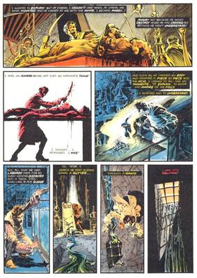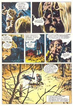 Y así podemos viajar, desde los decadentes escenarios del terror gótico en “Feed it!” y en “Clarice” (excelente relato en verso alla Poe escrito por Bruce Jones), a delirantes futuros post-apocalípticos: “Mother toad”, “The last hunters” (casi un cuento ilustrado sobre los últimos vestigios de la humanidad, en el que Wrightson da cátedra en el diseño de personajes) y “A martian saga” (otra historia en verso, esta vez a cargo de Nicola Cuti, con una vuelta de tuerca cómica al final). También hay lugar para las aventuras en lugares perdidos (“The Pepper Lake monster”, “The laughing man” con guion de Jones), historias que rescatan el espíritu de leyendas fantásticas rurales (“King of the mountain, man”, “Uncle Bill’s barrel”) y adaptaciones de clásicos: “Sleepy Hollow”, en la que colabora con Jeff Jones y Alan Weiss sobre un guion de Virgil North/ Mary Skrenes; y dos fantásticas versiones de “The black cat”, de E. A. Poe y “Cool air” de H. P. Lovecraft, en donde hace gala de su talento para los climas, los encuadres y el manejo del claroscuro. Cabe destacar también el homenaje pesadillesco a Little Nemo en “Nightfall”, con guion de Bill DuBay.