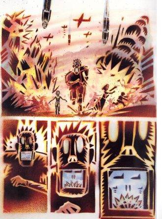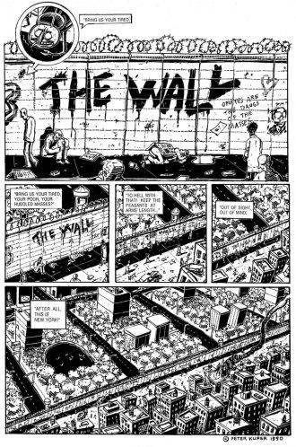 Kuper a nivel dibujo es bastante particular, con un estilo pictórico de fuerte influencia expresionista (Edvard Munch a la cabeza, de hecho cita varias veces el famoso cuadro El grito) y con una utilización fuerte de stencils para colorear y/o generar diversos tonos grises. Sin embargo acá no se queda solo con su forma más reconocible, sino también que pela otros estilos más basados en lápiz y entintado convencional, y también dibujos que parecen más bocetos realizados a mano alzada, que es como elige dibujar sus historias más personales de los primeros dos números. En los últimos tres números, sin embargo, hay adaptaciones de cuentos de Franz Kafka donde se mete con el cubismo y con unas puestas de página bastante experimentales, bien reconocibles en The System. Si hay algo que muestra fuerte en estas revistas, es su virtuosismo y su habilidad para metamorfosearse según lo amerite la situación.
