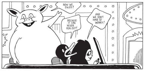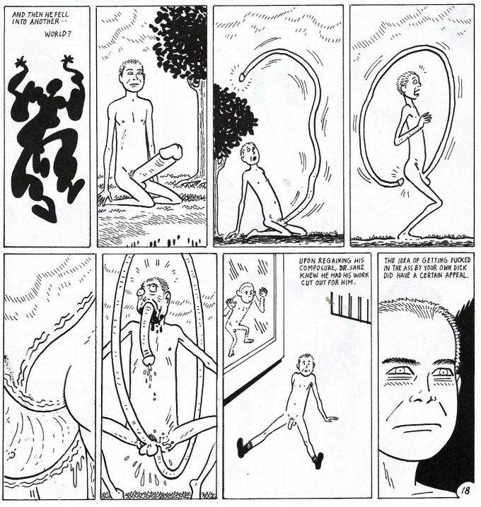 Tales Designed to Thrizzle son, de momento, ocho números (Kupperman trabaja ahora a través de Patreon) enfermizos, actualmente recopilados en dos hardcovers y también en formato digital a través de Comixology. En toda la serie repite un chiste: la revista está dividida en tres partes, una para adultos, una para chicos y otra para viejos. No hace falta aclararlo, esa división no afecta un carajo a las historias, que tampoco podemos considerarlas así. Al igual que la antología que visitamos el mes pasado, Naked Brain, acá Kupperman tira chistes que duran una o dos páginas, aunque claro, todo está repleto de personajes (y situaciones) recurrentes.