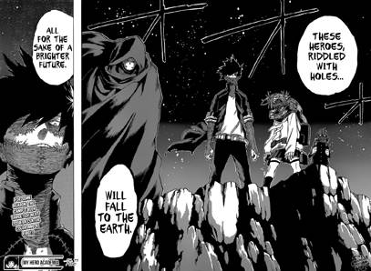 En el mundo ficticio que se nos presenta, ya nos tiran un par de ideas y conceptos interesantes: Organizaciones gubernamentales, agrupaciones de villanos organizados, cuestiones sociales, matrimonios por arreglo para dar a luz niños con poderes particulares o mejorados, experimentos genéticos, ideologías y rivalidades. Este tipo de obras están concebidas para ser largas, duraderas. En general, al pasar el tiempo y con el éxito cosechado, vamos conociendo más sobre la cosmología que Horikoshi tiene en mente. Particularmente, noté que el autor tiró toda la carne al asador en su segundo año de publicación, me cuesta concebir cómo va a seguir ahogándonos en esos momentos culminantes, ese clímax que logró allá por los episodios 90 al 95. Pero se nota que Horikoshi sabe lo que hace, así que claramente, voy a seguir leyéndolo con mucha emoción semana a semana.