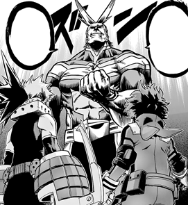 All-Might es un tipo que siempre sonríe. Una montaña de músculos. Es invencible. El héroe Número Uno del planeta, el más popular y amado por todos. Es un Superman que no tira rayos, pero con esa espectacularidad y exageración que sólo vemos en el manga. Aparece dibujado con trazo grueso, un elemento estético muy interesante que hace que destaque y contraste con el resto.