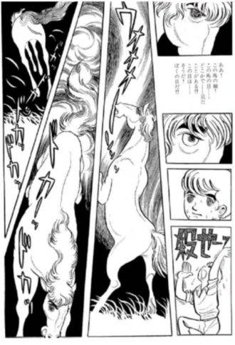 Para ser una obra bastante jodida, también tiene bastante de absurda, una característica (que ustedes pueden juzgar si esto es positivo o negativo) de la que luego Tezuka se deshace por completo. Muchas de las cosas que pasan, la aparición del caballo fantasma incluido, salen un poco de la nada y sin mucha justificación al respecto; simplemente ocurren. Algunas de estas situaciones están para tensar el aire y que comiencen a ocurrir las tragedias sin ninguna clase de trasfondo. Tezuka reconoció en los comentarios que hizo sobre la obra cuando se recopiló en el Complete Manga Works, que estaba en un período de prueba y error, donde a veces los cambios ocurrían dentro de la serialización misma, lo que “justifica” en cierta manera la cantidad de volantazos que tiene la narrativa.