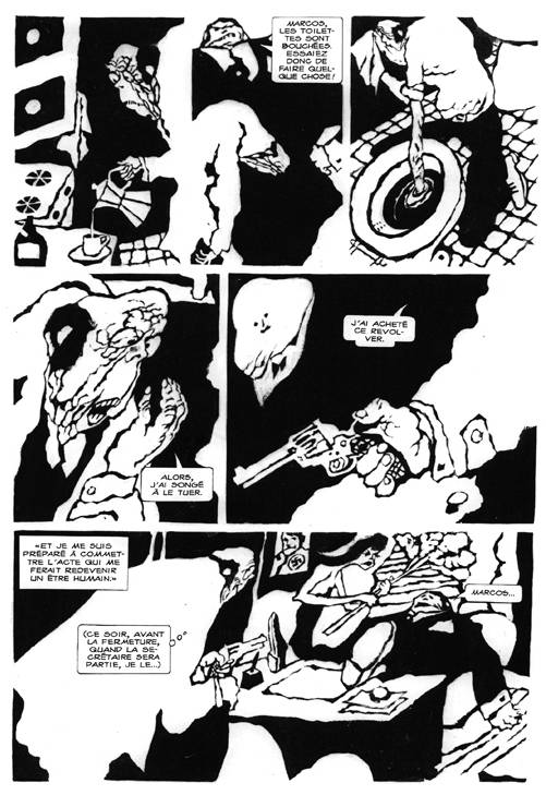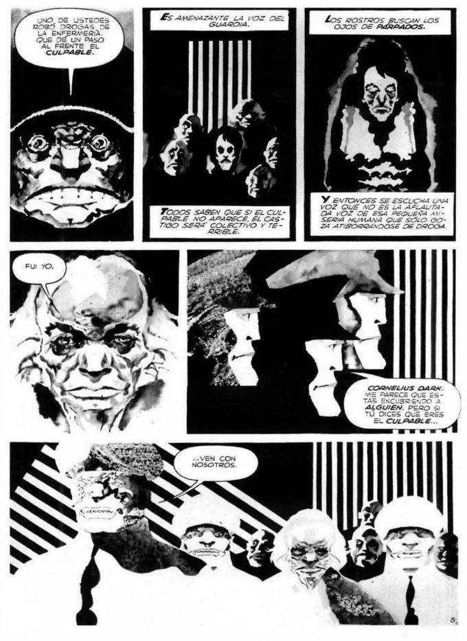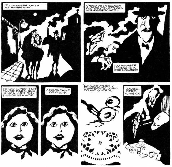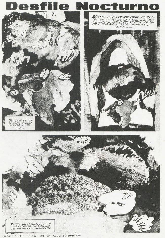 Y para la misma época en la que se termina Buscavidas, Trillo y Breccia realizan una historia muy corta, de apenas siete páginas, también en ese blanco y negro extremo, que se titula «Desfile Nocturno» y se va a publicar recién en 1984, en el nº100 de la revista Skorpio. Es un guion muy menor, pero no se puede dejar afuera, porque será la última colaboración de esta dupla, y además la última historieta de Alberto que aparecerá en una revista de Record.