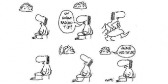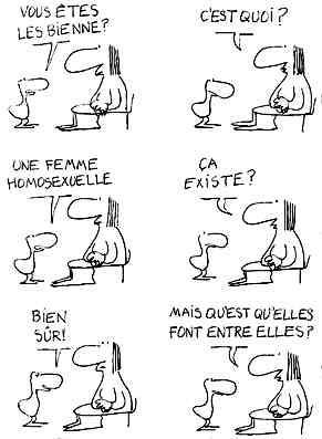 “Nadie quería saber nada con la tira, -contaba Copi en una entrevista- yo mismo no estaba demasiado convencido y empecé a hacerla con el solo apoyo de [el editor Serge] Lafaurie; el resto opinaba que ‘le truc’ [sic] no hacía reír a nadie”. Contra todos sus pronósticos, la historieta permanece muchos años en Le Nouvel… y obtiene el premio Humor Negro en 1966. Por allí desfilan sus personajes recurrentes: la Mujer Sentada, la hija, los pollos y otros especímenes de formas variables. Se impone su estilo absurdo y desganado, de una sutil ironía, plagado de silencios incómodos y frases aún más incómodas, que le serviría de magnífico ensayo para lo que más tarde desarrollaría en teatro. Muchas interpretaciones se han tejido alrededor de las peculiares relaciones que mantienen sus personajes, pero todas, o la gran mayoría, le son ajenas a su autor. “La mujer sentada es la estabilidad y, en última instancia, el Poder –confiesa Copi, finalmente-; el pollo es más débil porque no tiene silla, si tuviera una silla sería igual que la mujer. Pero cuando dibujo nunca pienso en todo eso. Sale así nomás”. Gracias a la notable repercusión que gana en Francia y a la edición de su primer libro, la historieta comienza a publicarse en varios países (España, Italia, Estados Unidos, Dinamarca). “Si la hiciera originalmente para cada uno de esos países, no sé si sería así –dice, sorprendido-. En Buenos Aires hubiera hecho algo completamente distinto; la mujer sentada únicamente puede convenir en un país donde el kilo de tomates hace ocho meses que vale lo mismo, a un país que tiene edificios viejos de tres o cuatro siglos”.