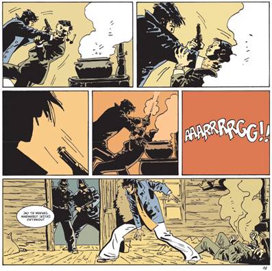 Y lo que hace Pellejero con el dibujo es increíble. Es cierto, viene de la misma escuela gráfica que Pratt, y desde sus primeros trabajos tomó elementos de la narrativa del veneciano… pero eso no hace menos asombrosa la fusión molecularmente perfecta entre los rostros, los paisajes, el lenguaje corporal y el manejo de la mancha típicos de Pellejero con los de Pratt. Por momentos pareciera que Corto y Rasputín están atrapados en una historieta de Pellejero, por momentos parece que los dibujos del catalán se cuelan en una obra del Tano… es una danza visual absolutamente cautivante, y con un trabajo formidable en el color, añadido por el propio Pellejero.