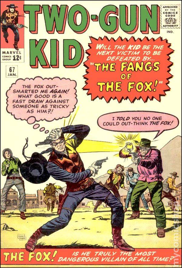 Pero claro, para 1962, el western empezaba a quedar “out” y los personajes enmascarados volvían a estar “in”. Los Fantastic Four ya habían comenzado su andadura y ya empezaba a notarse su influencia. Así, el Two-Gun Kid renacería en una nueva versión, que decididamente empezaba a mezclar elementos de lo que iríamos a conocer como el estilo Marvel. En el nº 60 de la revista Two-Gun Kid, de Noviembre de 1962, Stan Lee y Jack Kirby nos presentaban al nuevo Two-Gun Kid. Matt Hawk era un joven abogado recibido en Harvard que llegaba a Tombstone, Texas, a ejercer su profesión. Y lo primero que pasaba era que un grupo de cowboys lo molestaba públicamente y solo lo dejaban en paz cuando Nancy Carter, la maestra del pueblo y media hermana de uno de los de la pandilla, se metía en el medio. Rápidamente se notaba que entre Matt y Nancy había onda.