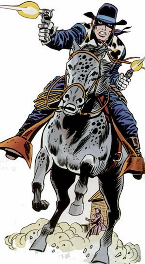 De ahí en más, el Two-Gun Kid se convierte en una leyenda del Oeste, que hará justicia con su identidad secreta. Solo conoce su doble identidad su compañero y amigo, el herrero Boom-Boom Brown, un tipo grandote que normalmente lleva puesto un sombrero muy alto. El Two-Gun Kid no solo enfrentará a los típicos cuatreros y bandidos de turno, sino que se topará tanto con personajes reales del Far West como Frank y Jesse James, Geronimo y Billy The Kid, como con personajes disfrazados y hasta con poderes que bien podrían ser de la galería de villanos de Batman: The Fox (un villano con un mascara de zorro), The Panther, The Rattler (villanos sin poderes pero con trajes deudores de los superhéroes), el Silver Sidewinder (un tipo capaz de hipnotizar al Kid) y Hurricane (que ingirió un extracto indio y adquirió supervelocidad por un tiempo). Tal vez el más interesante de todos sea el Purple Phantom, un cuatrero líder de una pandilla que aparentemente es un fantasma: de repente no se le ve la cabeza o le desaparece el cuerpo, aunque en realidad lleva puesto un traje fosforescente reversible: cuando lo pones del lado negro, parece desvanecerse en la oscuridad como un fantasma. Atenti con esto, porque ya venía de otro lado y va servir a posteriori para… pero no nos adelantemos.