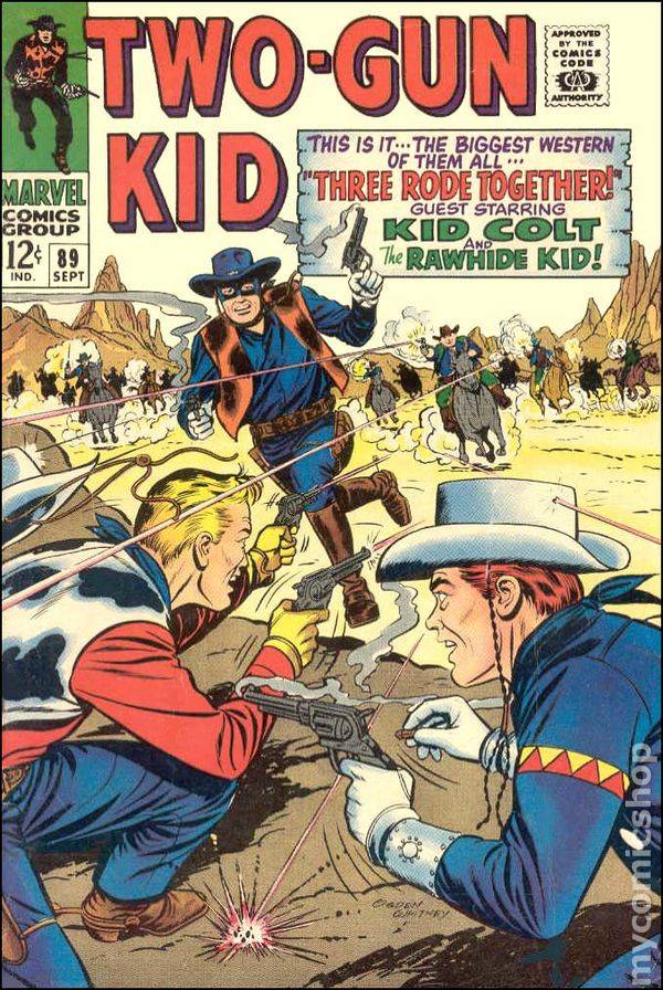 También va a empezar a aparecer en las historias otro tópico del Universo Marvel: el team-up con otros personajes. El Two-Gun Kid va a tener aventuras en conjunto con los otros dos cowboys estrellas de Marvel en esos años, el Rawhide Kid y Kid Colt: Outlaw, tanto en su título como en el de ellos. De hecho, en una de estas historias, vuelven a usar el truco del “fantasma” con pintura fosforescente que brilla en la oscuridad, esta vez como truco de los héroes para detener a un grupo de bandidos.
