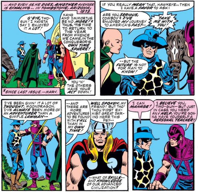 Pese a la cancelación de esta revista, la carrera de Matt Hawk va a tener un segundo aire por obra y gracia del conocido truco del viaje temporal. En el nº142 de Avengers (escrito por Steve Englehart y dibujado por George Perez) Thor y Moondragon llegan al Tombstone del Siglo XIX y encuentran a Hawkeye, quien había sido desplazado primero por Kang. Alli conocen a varios de los héroes del Oeste de la Marvel (incluyendo a Matt Hawk) y logran detener los planes de Kang para alterar el pasado y de esa manera cambiar el presente. Al terminar, el Two-Gun Kid (que se hizo amigo de Hawkeye) les pide que lo lleven al futuro. Y lo hacen. Junto con Hawkeye (que deja los Vengadores por un tiempo), se van un año a recorrer el Oeste del Siglo XX, a vivir aventuras de bajo perfil, hasta que, atacado por la nostalgia, Matt pide que lo devuelvan a su tiempo. De ahí en más, este viaje temporal será continuamente reconocido en la Marvel en cuanta aparición en el Oeste haya de los personajes del Siglo XX. De hecho, en la serie de She-Hulk del 2005, la Time Variance Authority (algo así como la agencia que controla la continuidad en el Universo Marvel) lo manda al Kid al presente, para que no haga cambios en el futuro. Y se va a convertir en secundario de la serie: lo veremos primero trabajar como cazador de recompensas legal, luego como parte de la Iniciativa de Tony Stark post Civil War y saldrá con una de las abogadas del estudio de She-Hulk. Teóricamente aún continúa ahí.