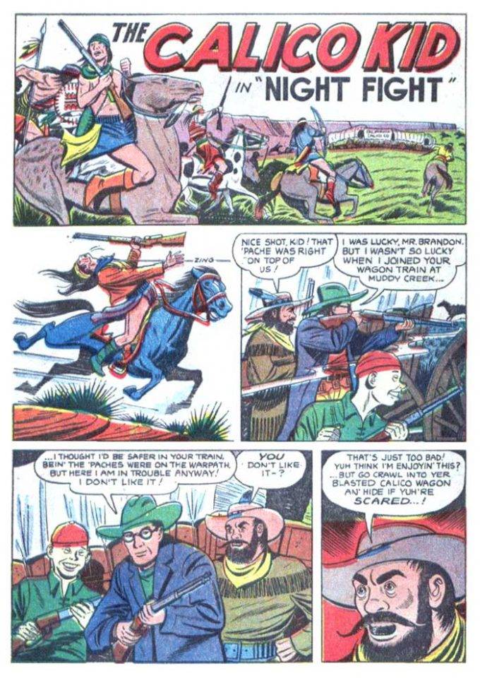 En ese año, un joven que estudiaba en la escuela de Burne Hogarth (el célebre dibujante de Tarzan) entró a dibujar para la línea de Magazine Enterprises. Su nombre: Dick Ayers. Tras algunas historias, Sullivan lo llamó y le ofreció dibujar una serie western de un personaje llamado The Calico Kid, cuya primera aparición fue en el nº6 de la revista Tim Holt (Mayo de 1949). El Calico Kid era la típica variación de Clark Kent llevada al Oeste: un tipo de lentes que no parecía capaz de matar una mosca, pero se cambiaba y salía a hacer justicia contra criminales. Tenía un “sidekick” chino, Sing Song, que era de esos estereotipos que hoy serían imposibles de poner en una historia, pero fuera de eso, no era un personaje interesante. Para el nº11, estaba claro que algo había que hacer.