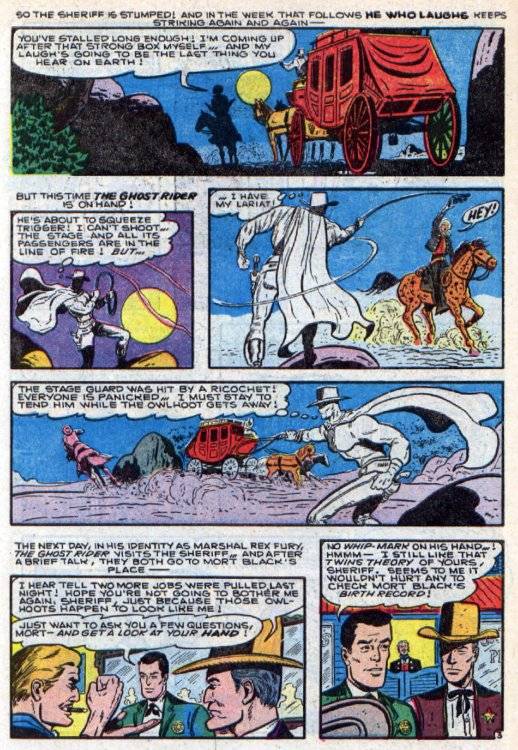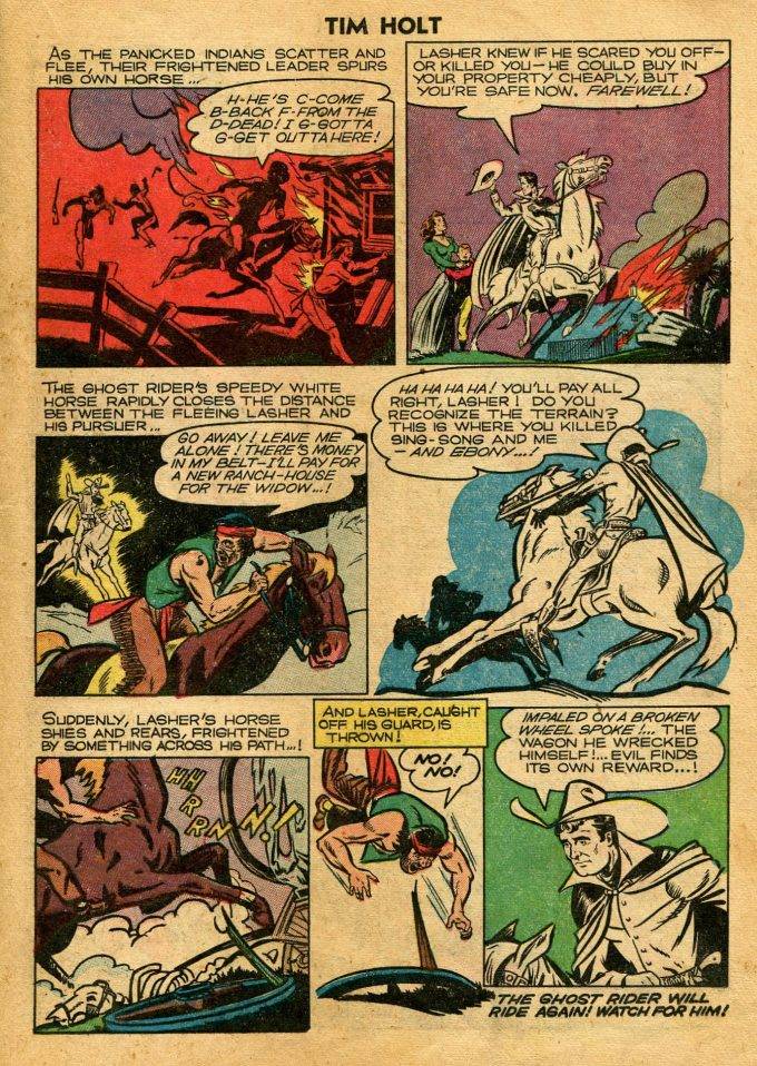 “Ghost Riders In the Sky” se grabó en 1948 por primera vez, pero se volvió un clásico de la música country al año siguiente cuando la versión de Vaughn Monroe se convirtió en un hit. La historia habla de unos jinetes fantasmales condenados a cabalgar eternamente por sus malas acciones. Sullivan o Krank se inspiraron en ella y decidieron usar la idea para rehacer por completo al Calico Kid. En el nº11 de Tim Holt, el Calico era atacado y capturado por una banda de indios liderados por un renegado blanco llamado Bart Lasher. Y además, al fin descubríamos que el Calico Kid se llamaba en realidad Rex Fury y era un “marshall” federal del gobierno yanki encubierto. Lasher los arrojaba a él y a Sing Song a una catarata que parecía que lo mataba. Sin embargo sobrevivían y Fury, aprovechando que lo creían muerto, se pintaba de blanco y aparecia como un fantasma para asustar y detener los ataques indios. Lasher, aterrado por la persecución del “fantasma”, caía del caballo y terminaba accidentalmente empalado (eran los años antes del Comics Code). Y Rex Fury tenía una nueva identidad, el Ghost Rider.