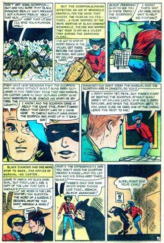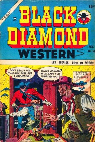 Black Diamond comenzó en el nº 9 (y primero) del comic book Black Diamond Western, de Marzo de 1949, creado por Wiliam Overgard, un dibujante eficaz aunque muy de segunda fila, y duraría hasta el nº60 (Marzo de 1956) cuando cerraría, junto con toda la línea de comic books de Lev Gleason. Lo iban a dibujar muchos artistas como Myron Fass, John Forte (el de Tales of the Bizarro World y las primeras Legion of Super-Heroes), Bill Walton, Dick Rockwell y Doug Wildey (el creador visual de Jonny Quest). Pero, por una vez, lo interesante aquí no son los dibujos sino las historias, que –como todas las que salían de Lev Gleason- son muuuuy habladas, de diálogos muy recargados pero en general con argumentos muy bien escritos y desarrollados. No voy a decir que le hacen el aguante a Blueberry o al Sargento Kirk pero están bastante por arriba del guion promedio de esos años. Merecen una leída. Ah, el personaje no ha vuelto a ser usado más que en alguna reimpresión. Hay otro Black Diamond que hizo la AC Comics pero no tienen nada en común.