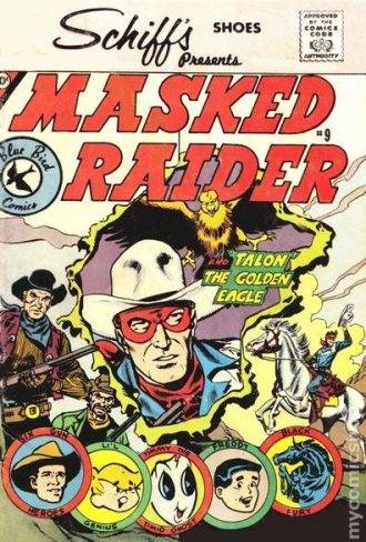 Ya que estamos con Charlton, ellos además tuvieron no uno sino dos cowboys enmascarados en sus páginas. El primero fue el Masked Raider, creado en 1955 por un guionista desconocido y dibujado en su primera aparición aparentemente por Mike Sekowsky. Les Wilcox es en la vida cotidiana un pobre pibe que estudia para abogado y es visto por todos (incluyendo su padre y por el interés romántico de la serie, la hija del sheriff) como un cobarde que no es capaz de enfrentarse a ningún criminal. Pero, en menos de lo que decimos “Clark Kent”, cuando nadie lo ve se convierte en el Masked Raider (no, no es el mismo de Marvel del que ya hablamos) y sale a impartir justicia acompañado de (y este es el detalle original) su mascota, un águila llamada Talon, que es sorprendentemente efectiva. Salieron 30 números de la revista del Masked Raider hasta 1961, dibujados por gente como Jack Sparling, Rocke Mastroserio, Charles Nicholas y –sobre todo- Pete Morisi, que tiene un dibujo muy bueno. Eso sí, las aventuras, muy anodinas como la mayoría de las de Charlton.