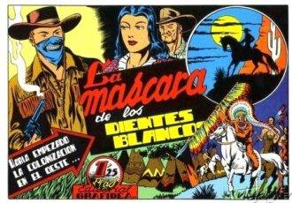 Un poco más atrás en el tiempo, nos encontramos con uno de los primeros trabajos de Martínez Osete, en 1948, para la editorial Grafidea: La Máscara de los Dientes Blancos. Un enmascarado justiciero y vengador cuyo principal rasgo distintivo es un pañuelo que le cubre la cara que lleva estampado una sonrisa de dientes blancos, de ahí el nombre por el que es conocido. Sabemos que quiere vengar el asesinato de su madre y que nadie sabe su identidad secreta, aunque sospechamos desde el momento uno que es Jim “El Apocado”, un vaquero de la zona. Por cierto, la Máscara tiene dos ayudantes, Corto y Largo, que son alivio cómico al estilo Laurel & Hardy. Escrita por el guionista Federico Amorós, la serie constará de veinte números. Hubo un trunco intento de reedición en formato vertical doce años después, pero quedaría ahí.