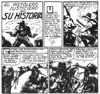 ¿Les quedó claro? Por supuesto, el asesinato de la madre que al final no lo era hace que Jimmy Baker se ponga del lado de los buenos y trate de detener a su padre como El Pistolero Justiciero. Eso sí, en las historias (guionizadas por Manuel Quezada) el personaje no siempre usa la máscara. A veces el que la usa es su padre, como líder de los bandoleros. Pero cuando logra eliminarlo, Jimmy la usa, aunque luego la deja. Sí, sí, un telenovelón de aquellos que solo va a durar doce números (que tienen la peculiaridad de no estar hechos en formato apaisado como la mayoría de los que se hacían en esos años), probablemente porque tiene más idas y vueltas que partidos en los que Patricia Bullrich militó.