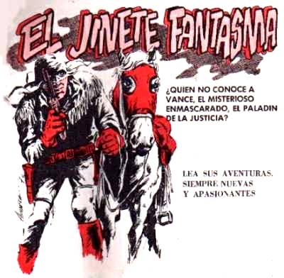 Por el lado de Chile tenemos un caso curioso,:El Jinete Fantasma (no confundir con el héroe español del que hablamos unas entregas atrás o con el Original Ghost Rider yanki del que hablamos ya hace bastante tiempo). Durante la década del ´60, la editorial chilena Zig Zag publicó una cantidad muy amplia de historietas en forma de comic book de muchos géneros, inclusive el western. El Jinete Fantasma fue una de las cabeceras, que contaba con varias historias, algunas traducciones de material extranjero (en general inglés) y otras hechas localmente, como es el caso de la historieta del mismo nombre de la revista, que ocupaba normalmente la mitad de cada número. Pero, curiosamente, el protagonista no estará enmascarado hasta bien avanzada la serie.