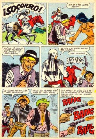El nº 1 de El Jinete Fantasma, aparecido en Octubre de 1965, traía la primera historia del personaje, dibujada por Juan Araneda y escrita por no sabemos quién. Y tiene su miga: resulta que Bobby Noland es el hijo de 23 años de un poderoso estanciero del Oeste, pero ha sido criado como un petimetre que no sabe defenderse por sí solo. Y por eso su padre decide que es hora que vaya a recorrer el Oeste para endurecerse… después de haberlo criado entre rosas previamente. No sé si voy a defender mucho las habilidades parentales del quía. Eso sí, como sabe que, sin ayuda, Bobby va a terminar mal, decide contratarle a un ángel guardián. Vance, el capataz del rancho, debe proteger a Bobby para que no le pase nada… sin que éste lo sepa, como un “jinete fantasma” protector. Y es lo que Vance hará concienzudamente, hasta que, poco a poco, Bobby irá adquiriendo la destreza para ser un tipo que puede defenderse solo en la vida. Y ahí vuelven al rancho y Bobby terminará de sheriff del pueblo donde está el rancho. Pero hay más: resulta que Vance… es hijastro del padre de Bobby , que tuvo un romance con una nativa americana. O sea, es medio hermano de Bobby. Vance se quedará en el rancho con su padre y medio hermano, en teoría para ayudarlos. Y el Jinete Fantasma seguirá arreglando entuertos… pero ahora, cubierto con una capucha blanca (cosa que antes no hacía) y con un traje del mismo color, con guantes rojos. Estamos hablando que esot pasa alrededor del nº 100 de la revista. Los guiones de la serie en esta etapa estarán en manos de Gustavo Arenas, Agustín Fernandez y Gustavo Marín, mientras que en los dibujos las firmas más recurrentes serán el ya citado Araneda, Manuel Rojas y Onofre Diaz.
