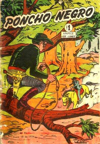 Tampoco hay muchos cowboys enmascarados creados expresamente para el mercado argento. Solamente tenemos dos registrados, ambos de la década de 1950. Ambos terminarán siendo dibujados en su momento por la misma persona y ambos se cuadran dentro de la variante local del cowboy enmascarado: el gaucho enmascarado. El más famoso de los dos es Poncho Negro, principalmente por el hecho de no nacer en la historieta sino dentro de los radioteatros de aventuras para chicos que en la década de 1950, antes de la televisión, era el principal medio de comunicación. Creado por Antonio Ortiz Noguera, Poncho Negro era un enmascarado que junto a su fiel indio Calunga (que hablaba en infinitivo como el pobre de Toro/Tonto) y su caballo Satán, aparecía a arreglar entuertos en un campo argentino… medio raro porque era más un campo genérico, sin demasiado énfasis en dónde ocurría la acción. Poncho Negro será el protagonista titular de la revista homónima –que igual era una antología de historietas- editada por Editorial Sensaciones en 1953.