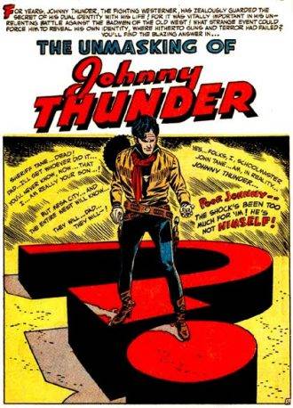 El primero en aparecer (en Agosto de 1948) va a robarse el nombre de un personaje menor de la JSA: Johnny Thunder. Y no, no tiene un genio que le cumple deseos. Y puede no llevar una máscara pero sí una identidad secreta. En realidad este Johnny Thunder se llama John Tane y es el maestro de escuela rubio y de anteojos de la ciudad de Mesa City, en el Salvaje Oeste. Además es el hijo del sheriff, que cree que ser docente no es trabajo de hombres y que su hijo es un debilucho. Por supuesto, en menos de lo que se dice “Clark kent”, John Tane se tiñe el pelo de negro, se saca los lentes, se pone otra ropa y se convierte en el azote de los criminales de la zona, para detener bandoleros, robos de ganado y demás cosas que ocurren en el género, montado en su veloz caballo Black Lightning (no, todavía no existía el personaje). Y será el propio sheriff padre (que no reconoce a su hijo sin lentes, fiel a las tradiciones supermanescas) quien lo apode “Johnny Thunder”. Como ven, los clichés de los superhéroes se usan aquí de manera similar.