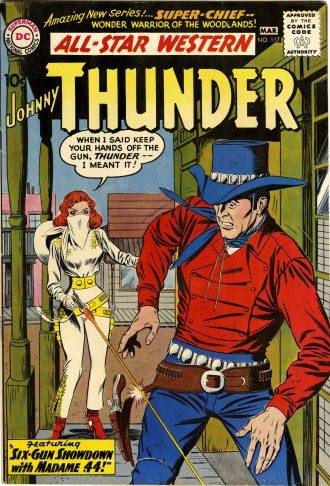 Como dijimos en el capítulo anterior, la carrera de John Tane, alias Johnny Thunder, venía desde 1948. Sin embargo para 1961, el western como género empezó a perder fuerza en los comic books a manos de los nuevos superhéroes que traía DC (justamente al revés de lo que pasaba cuando empezaron las historias de Johnny Thunder.) Por eso, en la All-Star Western nº117 (en una historia dibujada por Gil Kane), Johnny conseguía guionista nuevo (Gardner Fox, que reemplazaba al escriba casi perpetuo de Johnny, Robert Kanigher) y estrenaba una rival tan enmascarada como él: Madame .44.