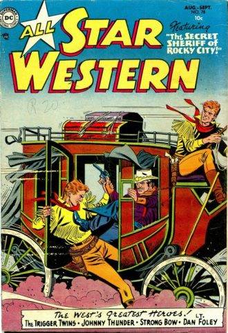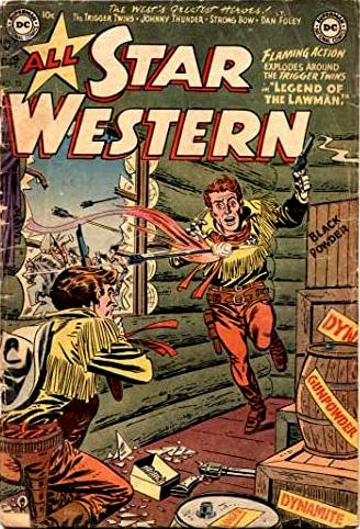 Como dijimos para 1951, los superhéroes estaban de capa caída y los cowboys estaban en alza. Así fue como la DC Comics convierte a la revista All-Star Comics –donde aparecía la JSA- en All-Star Western, donde aparecerían personajes del Oeste. En ese primer número, el 58, un par de aventureros con una identidad secreta muy curiosa, comenzarán su andadura: los Trigger Twins.