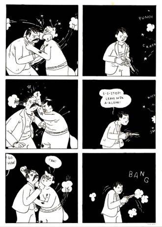 ¿Qué tiene para ofrecer Sammy? Como su coterráneo Johnny Ryan, Harkham presenta mundos plagados de mucho humor negro. Historias cortas cargadas con mismas dosis de mala leche y remates ingeniosos y graciosos. Pero lo más importante que tiene es su absurdo, cómo esos remates a veces caen de la nada o cuando estás con la guardia baja. Otras veces el chiste se estira, como en “Black Death”, la historia con la que arranca el nº1 de Crickets. En sus primeras cuatro páginas vemos a un tipo recibir una lluvia de flechazos y caer por un precipicio, como si fuera el Coyote. Toda una declaración de principios, si tenemos en cuenta que el resto de la historia (contada entre los nºs 1 y 2 de la antología) se trata de un recorrido sin suerte trazado por este accidentado anónimo que se encuentra con una mole retrasada y un extraño pervertido que estaba atrapado en un aljibe vacío. La historia no se termina de contar, se abandona, el estilo Adrian Tomine (tomado de Carver, por otro lado), pero en lugar de contar cotidianeidades, Harkham es más bucólico, diseña mundos donde Napoleón es, además de un férreo conquistador, un frustrado dibujante de tiras cómicas, un recurso que suele repetir para contar lo frustrante de su trabajo.