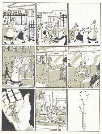 A todo esto se le suma su forma de narrar, pausada pero rápida, como la paradoja de Martin Hannett: el faster-but-slower con el cual supo guiar a Joy Division para explotar mejor su sonido. Por ejemplo, “Pobre marinero” tiene una grilla de doce cuadros que respeta a rajatabla con mucha viñeta muda donde suele apelar a la repetición (como hicieran el Viejo Breccia primero y Keith Giffen después) para mostrar hastío e incomodidad que se esconde con la lentitud del tiempo, pero Harkham también acelera los sucesos (también incómodos, por la mufa que carga Thomas), y a veces pone un gag atrás de otro en cada viñeta. De esto también se trata Sammy Harkham: un dibujante que carga las páginas con viñetas demasiado pequeñas pero su relleno es más austero, con líneas suaves aunque desprolijas, expresivas aunque por momentos ahorra en detalles. Lo que se guarda de fondo lo pone en las caras.