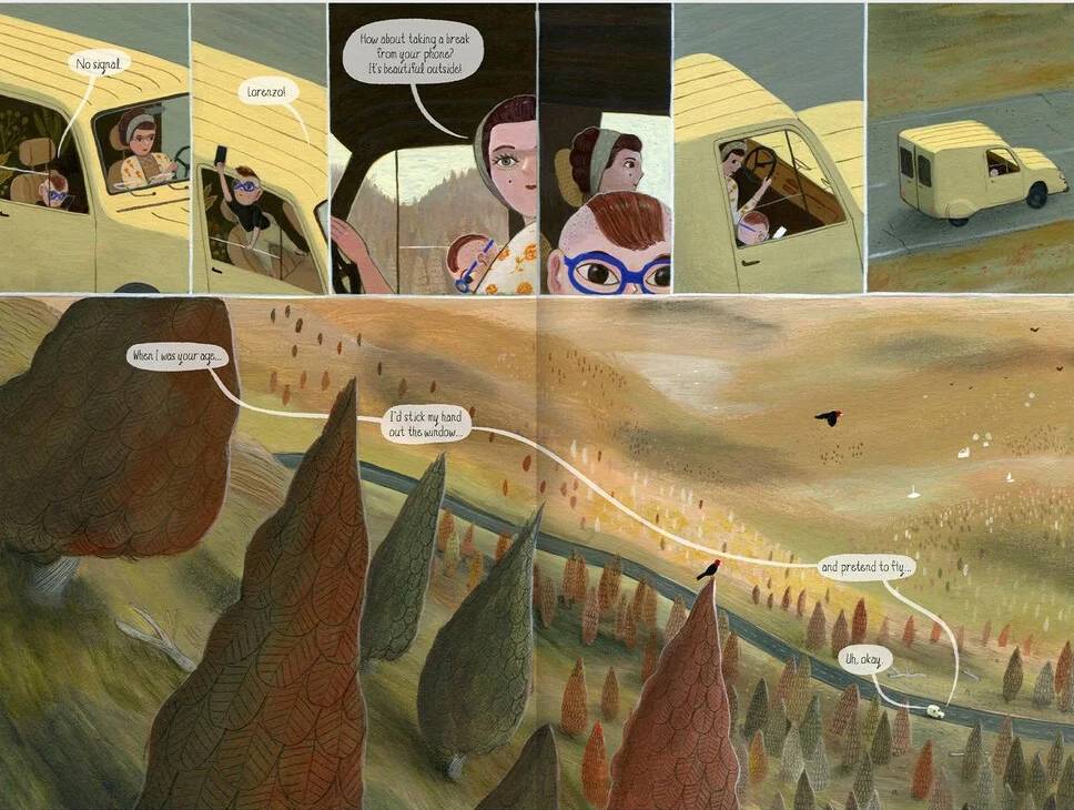 La novela gráfica maneja una propuesta visual muy particular. Por un lado, la realidad de Lorenzo y su mamá se encuentra repleta de paisajes y lugares acuarelados, con elementos vintage que nos sacan del presente para remontarnos a un pasado imposible de fechar. Por otro, está el mundo de los cuentos, cuyas páginas tienen la característica de ser completamente amarillas y tener dibujos que claramente han sido intervenidos a partir de papeles pegados al mejor estilo collage. Algunas páginas solo cuentan con una frase (que siempre parecen estar ahí para interpelar), y otras se encuentran repletas de detalles para proponer dibujos con paisajes y lugares complejos, con personajes super expresivos y capaces de comunicarlo todo con ¨su mirada¨. A todo eso, se le suman las páginas inundadas de los dibujos de Lorenzo, los cuales tienen un estilo totalmente aniñado, típico de los dibujos durante la infancia. En general, los tres estilos visuales se complementan muy bien entre sí para remitir a diferentes épocas y estilos: por un lado, un pueblo y una casa que parecen haberse quedado en los años ´60; por otro, los cuentos, con ilustraciones simples pero muy al estilo de lo que pudieron ser los cuentos del Pajarito Remendado o de los Cuentos del Chiribitil en las décadas del ´80 y ´90. Los dibujos bien típicos de las niñeces resultan en un plus que consiguen expresar el mundo interior de Lorenzo y todos los cambios que atraviesa desde que deja sus amistades alojadas en un celular, a la mudanza y al descubrimiento de un mundo más analógico y real, pero que al mismo tiempo está lleno de fantasía gracias a los cuentos.