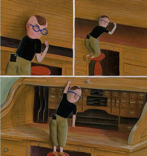 Aburrido y sin saber mucho qué hacer con su tiempo, Lorenzo empezará a explorar la nueva casa. Nada parece ser lo suficientemente interesante, pero todo cambiará en ese instante en que ¨levante la mirada¨… Literalmente, ese momento clave, será cuando Lorenzo descubra un antiguo escritorio en una habitación vacía que se llevará toda su atención. Lo que parece un simple mueble de antaño repleto de polvo, en seguida se vuelve un objeto enigmático cuyos recovecos y cajones cerrados buscará abrir a toda costa. El descubrimiento de ese mueble misterioso resulta en el punto de inflexión en el relato. Lorenzo ya no ¨volverá a bajar más su mirada¨ para concentrarse en la pantalla de su celular…