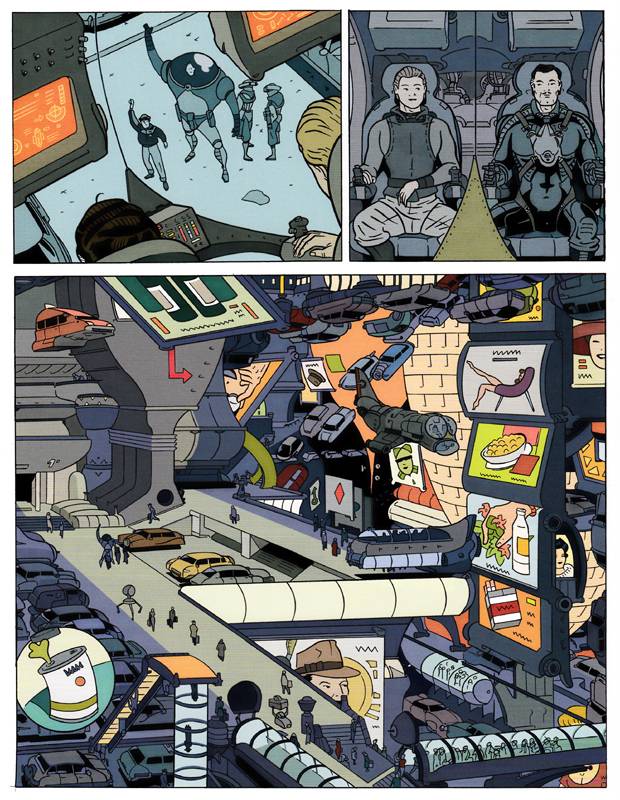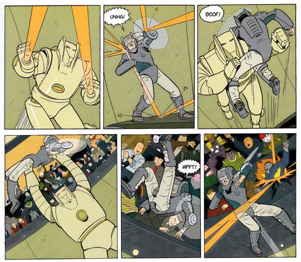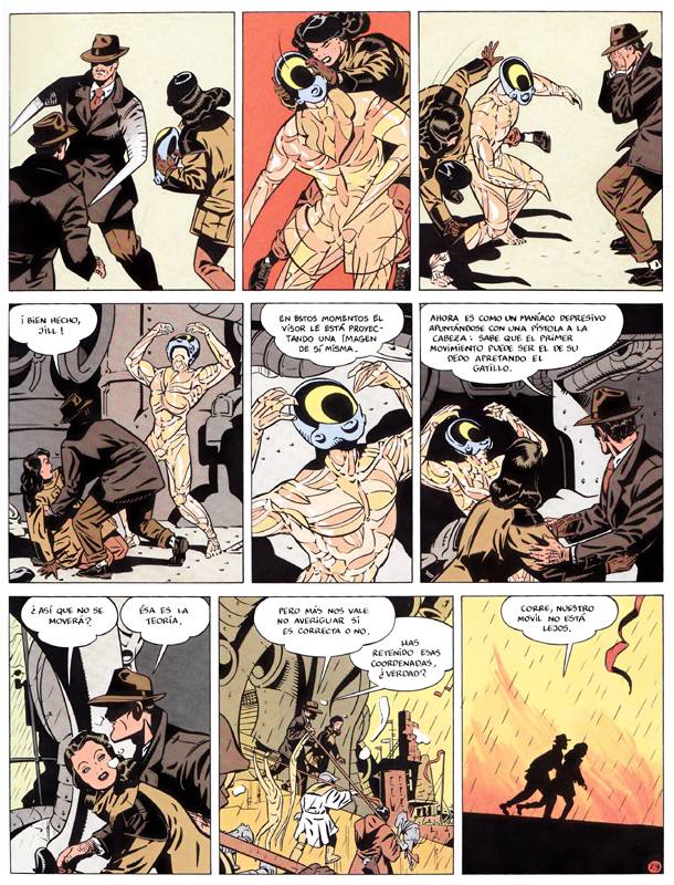 Con respecto al dibujo, estamos ante un autor mucho más maduro. Se nota que las líneas son más suaves y muchísimo menos cargadas. Ya no veremos esos fondos repletos de personajes, esa cinética constante a la cual nos tenía acostumbrados, con colores estridentes y personajes angulosos. Esta vez la paleta está más apagada, y ese cambio se siente bastante en la velocidad de la historia.