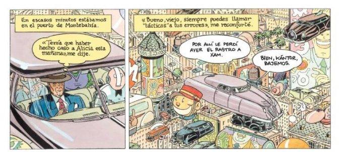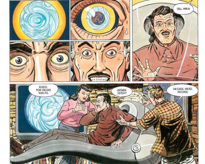 Y así hemos recorrido más de 40 años de la obra de Torres, todo para llegar a su última obra publicada al día de la fecha, sin contar recopilaciones o artbooks: El futuro que no fue. Situada en el universo Roco Vargasiano, esta vez nuestro protagonista no es otro que Archi Cúper. Sí, el detective al que supimos amar en El misterio de Susurro, vuelve a las andanzas con una increíble historia pulp. Olvidémonos de todos los avances argumentales y artísticos que Torres desplegó en historias anteriores, porque acá vamos a volver al trazo más crudo, con fondos sobrecargados, colores que iluminan cuartos oscuros, y unos diálogos retorcidos con un nivel de poética abismal. Vamos a tener un poco de todo lo que nos gusta: conspiraciones políticas, detectives, tramas ocultas y muchísima acción, todo narrado maravillosamente por un autor que no pierde su vigencia y se renueva constantemente, incluso mediante el uso de temas o personajes que uno creería habían perdido su esplendor. Como en ocasiones pasadas, la historia se ve mezclada con constante meta-relato, publicidades, enciclopedias y otras inserciones variopintas que aportan constantemente veracidad al mundo que el ídolo viene creando hace casi 40 años.