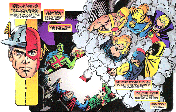 Históricamente, la primera evidencia de intención de armar una continuidad debe haber sido cuando allá en la mítica Flash de Dos Mundos decidieron ubicar a los personajes de la Golden Age en la Tierra-2 (The Flash nº 123, Septiembre de 1961, a cargo de Gardner Fox y Carmine Infantino, bajo la batuta de Julius Schwartz). Después abusaron de este concepto y se les fue a la mierda la cantidad de Tierras y perdieron el control de en qué Tierra pasaba cada historia. Hizo falta un Roy Thomas para trata de poner las cosas en orden, fue necesaria una Crisis on Infinite Earths para tomar el control de la situación y ordenar todo el caos que era la editorial y solamente así salir a vender que eran un universo cohesionado y serio, maduro y pensado par adultos.