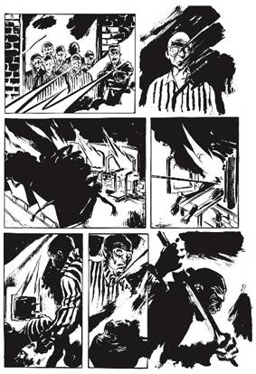 El dibujo de Kleist no se puede creer. Un blanco y negro crudísimo, con unas pinceladas increíbles y una claridad para mostrar los climas que shockea. Es impresionante el tratamiento que hace sobre el protagonista: conforme pasa el tiempo en los campos de concentración Harry va estando más flaco y más deteriorado, pero a su vez su rostro se va mostrando expresiones más sombrías, más oscuras, a medida que sacrifica parte de su propia humanidad en pos de sobrevivir. Realmente un trabajo impresionante y mi primer contacto con este autor, que por lo que veo tiene también editada en español una biografía de Fidel Castro, a la que ya me dan muchas ganas de entrarle.