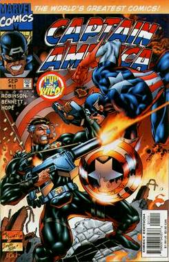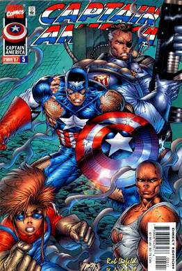 El n°1 de la nueva serie (Nov.96) nos presenta a un amnésico Steve Rogers, que vive en el seno de una familia normal de los ‘90 como si tuviera 30 años e ignora que, no sólo nació en los ‘20, sino que fue el más glorioso soldado yanki de la Segunda Guerra Mundial, el Capitán America. Paralelamente se nos muestra a una chica, Rikki Barnes (quien será Bucky) y a los jerarcas del World Party, partido político neo-nazi, liderado por el racista Master Man y bancado desde las sombras por el Red Skull. El Gobierno ordena a Nick Fury reactivar al Capitán y un anciano negro, Abraham Wilson, le entrega el escudo a quien fuera su camarada de armas en los ‘40, justo cuando los ataca un comando neo-nazi, que mata a Wilson. Pronto se aparece Fury y le explica a Rogers quién es y cuál es su rol en la lucha contra el resurgir de los nazis. Rogers no quiere saber nada, hasta que el tuerto le revela que toda su vida “normal” es una mentira del Gobierno y que su esposa e hijos con los que convivió durante años… son androides! Y ahí sí, el chabón se pone loco y acepta vestir una vez más el traje (con una aguilita del orto en lugar de la “A”) y salir a darle machaca a Master Man y sus súbditos. En eso consisten, básicamente, los n°s 3 al 5: machaca va, machaca viene y en el medio aparecen Bucky, Sam Wilson (piloto militar, hijo de Abraham, quien adopta la identidad de Falcon) y Crossbones (este último del lado de los malos, que por supuesto pierden). El n°6, crossover de la saga Industrial Revolution, tiene como co-protagonista a Cable (nunca peor dibujado) y como villanos a A.I.M., Modok y el Barón Zemo, en una trama sin ningún sentido lógico.