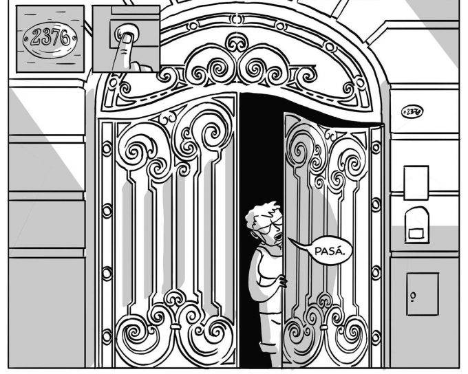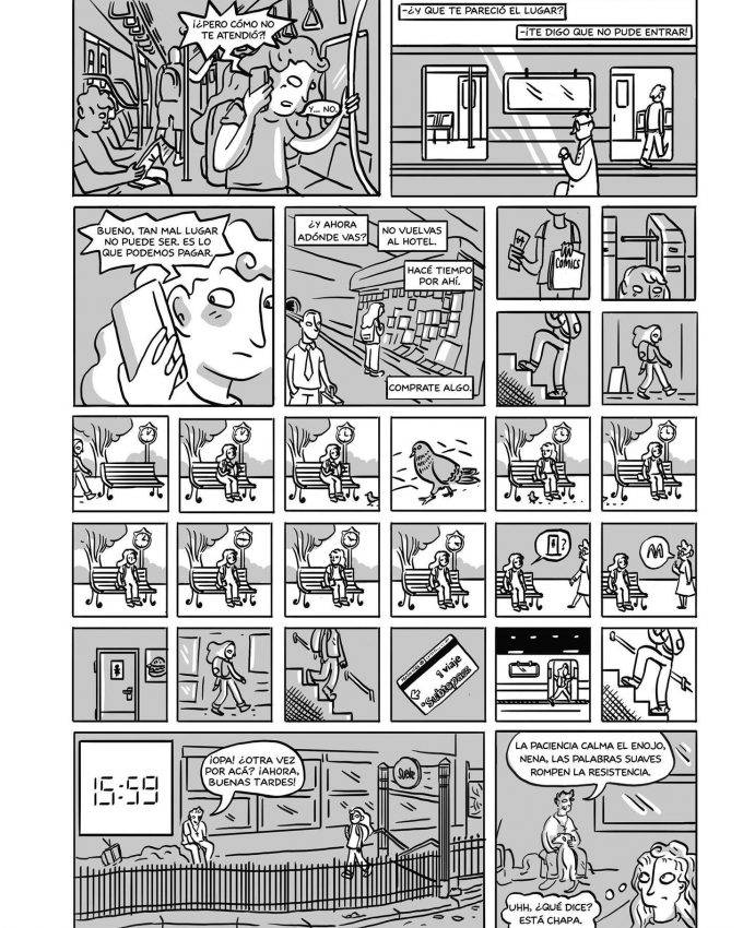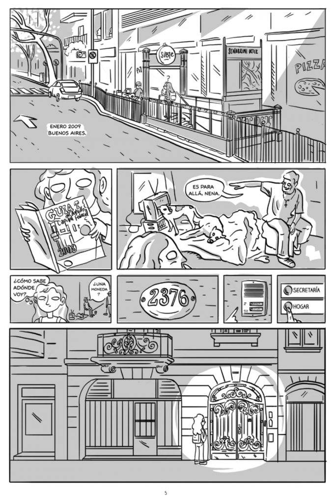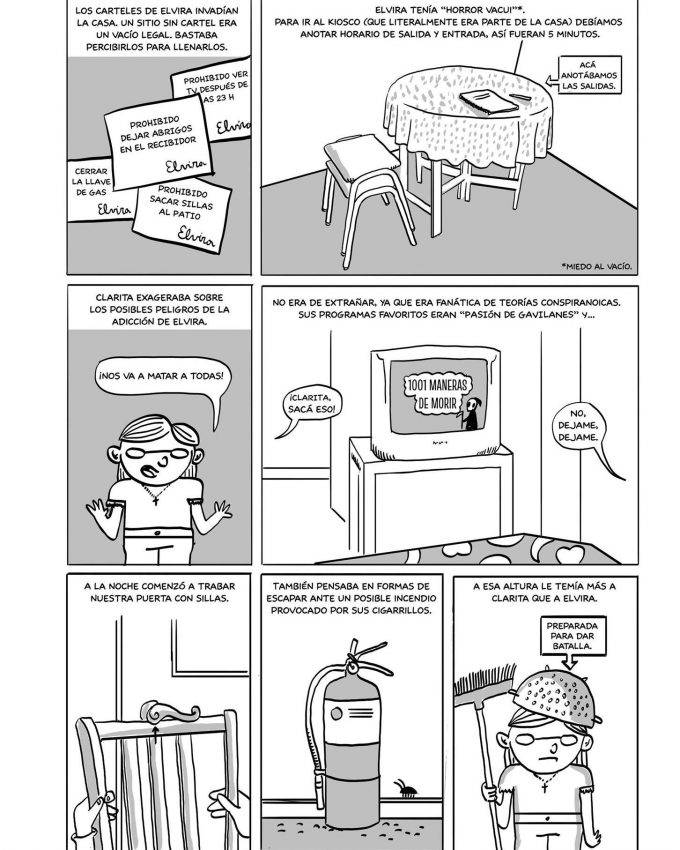 A partir de allí, a lo largo de las páginas de la obra, la joven estudiante recién llegada a Capital, tendrá que lidiar con Elvira, quien será extremadamente rigurosa con ella, como también lo es con las demás residentes. Marina se encuentra es un sitio definitivamente muy hostil con horarios muy estrictos, reglas muy duras, que, desde un principio planteará una convivencia muy compleja y traumatizante. Viñeta a viñeta, el trabajo de Sabattini cuestiona el concepto de ‘hogar’. Lo que debería ser una residencia segura, confortable y acogedora hacia la cual sentir un lazo emocional, donde sentir comodidad y tranquilidad luego de un día en la ‘gran urbe’, resulta un sitio poco amistoso y desagradable, que recuerda en cierto modo a una cárcel.