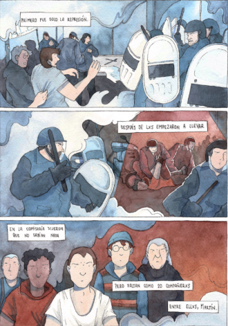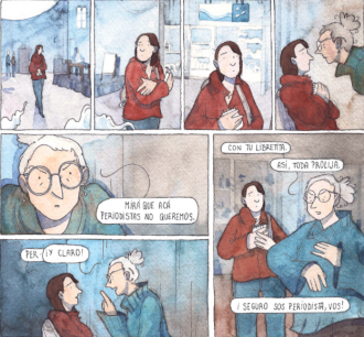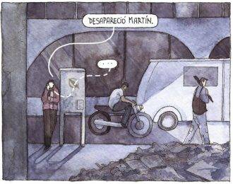 Ante el shock y el desconcierto, Natalia se lanza a la búsqueda de Martín. Para eso, tendrá que irse al Sur, lo cual hará en un largo viaje en ómnibus. Ella llevara consigo su mochilita, como así también una actitud total de periodista de investigación. Será a través de esas primeras viñetas que ya la autora nos meterá muy adecuadamente de lleno en la sociedad que ofrece situaciones poco amigables en la que transcurrirá toda la historia. Veremos a Natalia quien, mientras espera su salida en la terminal, es acechada por un grupo de policías que la interrogan: le preguntan a dónde va y por sus intenciones de viaje. Sin dudas, nos encontramos ante un entorno hostil, y Natalia tendrá que arriesgarlo todo por su hermano.
