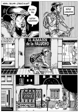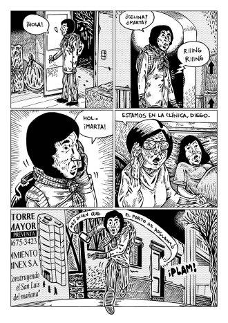 Rodrigo Terranova es un nombre conocido para quienes frecuentaran el blog de historietas autobiográficas Historietas Reales, allá por 2005. Los días viernes se publicaba allí La Divina Oquedad, desde cuyas páginas ya mostraba trazos y líneas reconocibles al instante. Tuvo su propio tomo entre los recopilatorios de la colección HR, que editorial Domus distribuyó por kioscos. Desde ese momento, dejó varias páginas dispersas en revistas como La Mano, Fierro, y (por supuesto) Comiqueando. Recién en 2011 llegaría Dos estaciones, otro libro con su firma, esta vez junto a la de Federico Reggiani como guionista. Aquél incluía dos historias breves: la de un personaje cuya memoria se ve sacudida metafísicamente a partir del fallecimiento de Raúl Alfonsín, en 2009; y una parábola invernal sobre las formas del colaboracionismo empresarial con la dictadura en pleno Mundial ´78. Para entonces Rodrigo Terranova ya es un narrador consumado, sus formas y valores de línea mantienen el sello distintivo, pero se notan totalmente controlados y en dominio del ritmo.